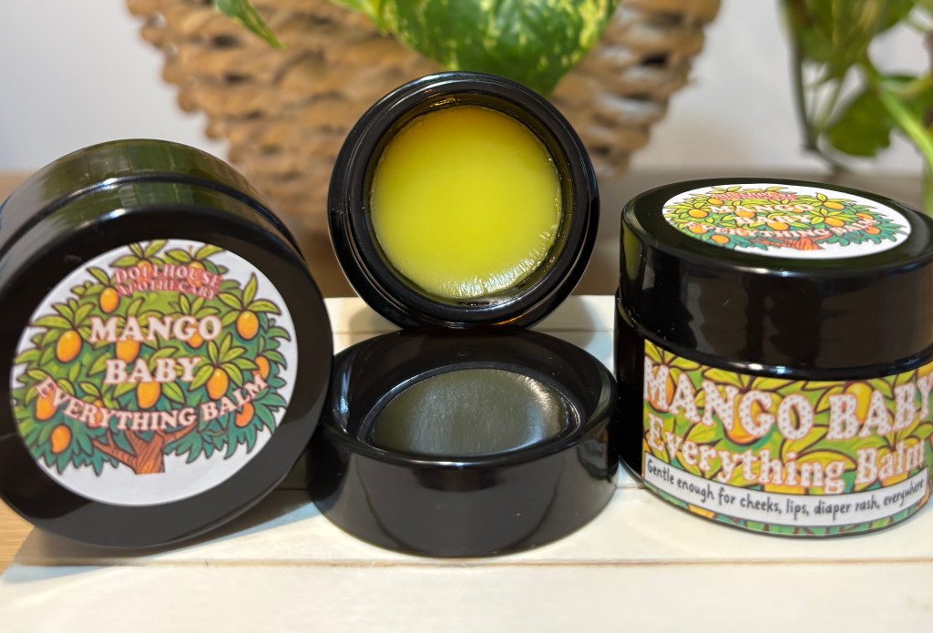 Mango Baby Everything Balm -$15 A gentle healing, calming, moisturizing and protecting balm for babies and sensitive skin types. Can be used on cheeks, lips, dry skin patches, diaper area and anywhere you need protection, repair or hydration.