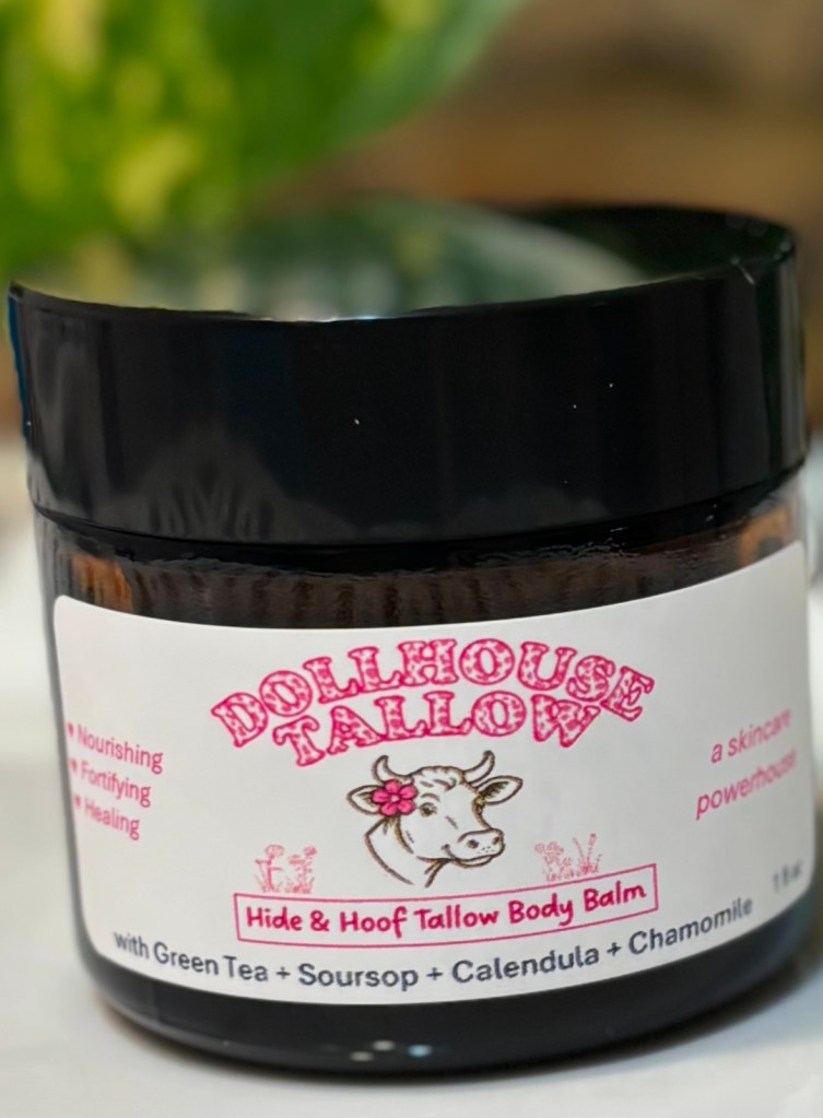 Ingredients: grass feed beef tallow, beeswax, organic green tea oil, organic soursop oil, organic chamomile oil, organic calendula oil, organic castor oil, Vitamin e, organic essential oils: vanilla, lavender, sweet orange, ylang ylang